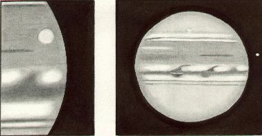 Jupiter, drawn by Ken Clarke, as viewed through a 10″ F4.3 Reflector, 308x. w1=291.4deg, w2=231.6deg, seeing 3-4/5, at 20:20 UTC on March 25th, 1991